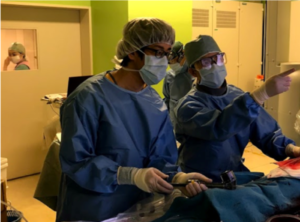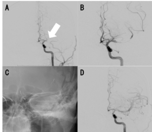 最近、虚血性心疾患と同様に超急性期脳梗塞の一部でもカテーテル治療が施行されるようになりました。当科には脳神経血管内治療学会の専門医が在籍しており、脳神経外科と協力して超急性期脳梗塞の血行再建治療を施行しています。症例数は徐々に増えており、2019年度は血栓回収療法が16件でした。