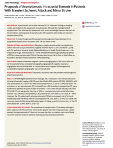TIA/minor strokeの無症候性頭蓋内血管狭窄は年齢により増加し、頸動脈狭窄より有病率が2倍!ただし脳梗塞再発、死亡率、虚血イベントと関連はない模様。「適切な再発予防の治療を受けている」が条件です。
