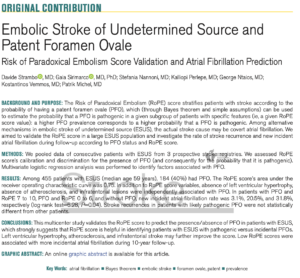 塞栓源不明脳梗塞でRopeスコアが高いと卵円孔開存が多く, 脳梗塞の原因に寄与している可能性が高かったという論文です。塞栓源不明脳梗塞患者ではRopeスコアをつけていくことが重要になってくるかもしれません。