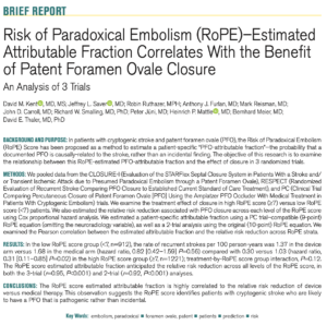 Ropeスコア第2弾。Ropeスコアが高いほど, 卵円孔閉鎖術による脳梗塞再発抑制効果が高いことが示唆された論文です。