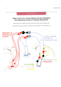 運動機能(歩行や姿勢)と認知機能(注意)との関連の背景である大脳皮質-線条体回路の詳細が解明されつつあります。アセチルコリン、ドパミンなどを活用した姿勢保持・歩行障害の治療への応用が期待されます。