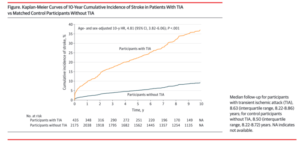 TIA発症後の脳梗塞発症率は、明らかに高いです。TIAと評価直後に上昇していますね。TIAへの啓発が活発になった21世紀!TIA後に適切な対応ができるようになったためか、TIA後の脳梗塞発症率は低下しているようです(本文参照ください)。私達も、直近のTIAは不安定狭心症と同等と考え緊急入院を原則としています。