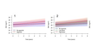 進行期パーキンソン病患者では体重減少・サルコペニアに起因する様々な問題が出てきますが、体重変化は治療薬にも影響されることが報告されています。L-dopa治療では経時的に体重は減少、ドパミンアゴニスト使用では増加する傾向が示されています。