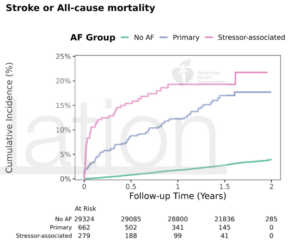 ストレス因子関連心房細動(stressor-associated atrial fibrillation: SA-AF)を調査したVITAL-AF試験の紹介です。SA-AFは、感染症、手術、急性疾患などの一過性の生理的ストレスを契機に新たに発症するAFとして定義されます。本試験では65歳以上の3万265名を対象としました。そのうち、AFを新規に発症したのは988例(3.3%)で、 そのうちSA-AFは290例(29%)でした。SA-AFの主な誘因は感染(40%)、心臓手術(26%)、非心臓手術(16%)でしたが、90日以内の新規抗凝固療法導入率は、  SA-AF 56%、原発性AF 75%と有意に低値(p<0.001)でした。主要複合転帰(脳卒中+大出血+全死亡)の発生率(/100人年)は 非AF 2.3、 原発性AF 15.1、 SA-AF 22.7と脳卒中・死亡リスクは原発性AFと同等でした。SA-AFは決して良性ではなく、しっかりと塞栓症予防することが大事だと感じました。(Strokeチームより)